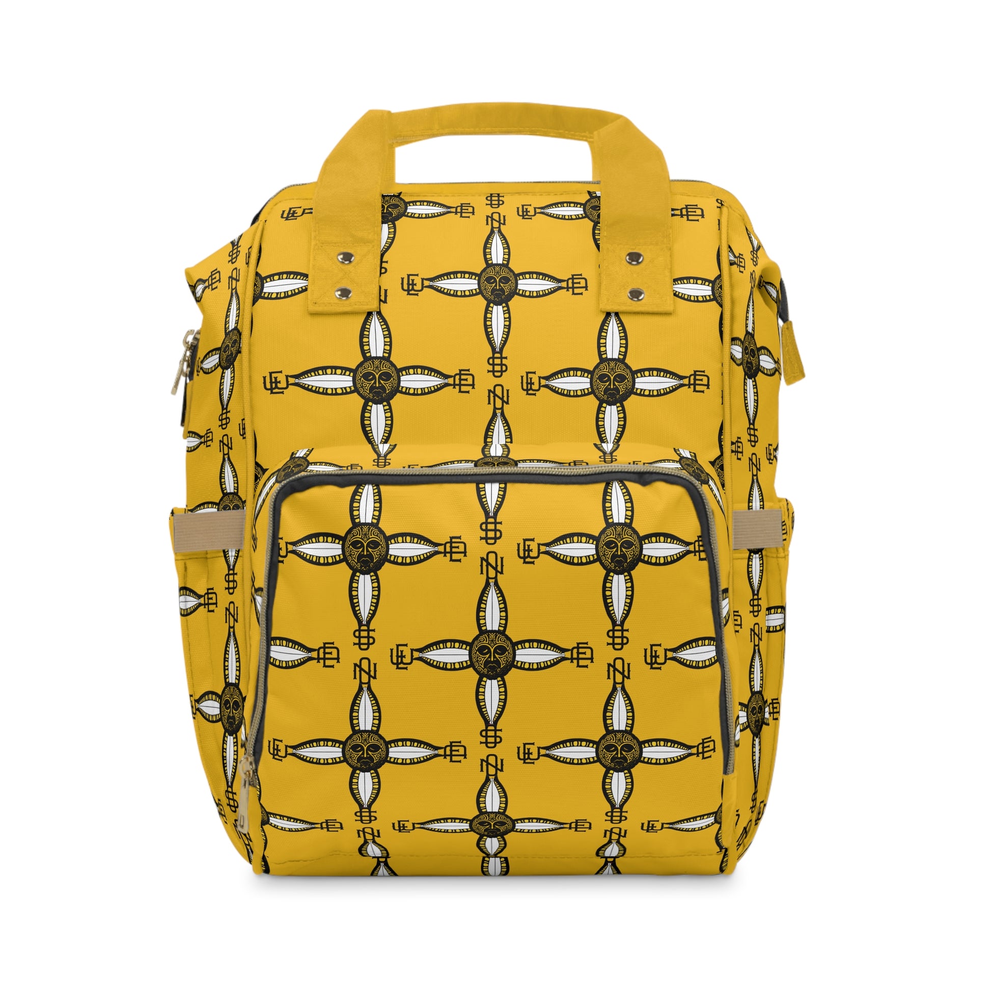 The Cowrie & Compass Backpack is a map, a prayer, and a statement—wrapped in sunlight. Drenched in a bold ancestral yellow, this piece carries a repeating pattern of cowrie shells and compass roses, merging ancient African economies with the universal language of movement and direction.